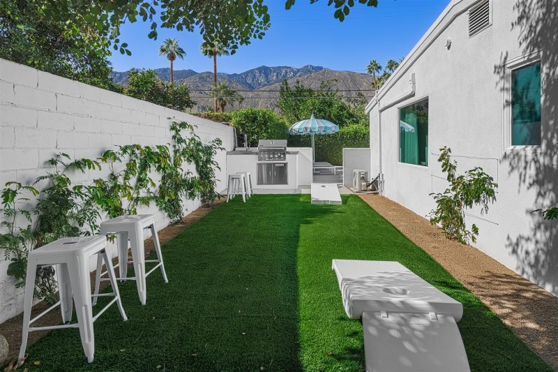 Located in the historic Deepwell Estates neighborhood, this Palm Springs vacation home features a large pebbletec pool, firepit and an expansive covered patio with ceiling fans, lounge seating and alfresco dining for six. Eight chaise lounge chairs, a built-in gas grill, cornhole boards , two umbrellas, a dense privacy hedge, tangelo, grapefruit and meyer lemon trees complete the West-facing resort-like backyard with panoramic mountain views. There are even five bicycles for you to enjoy.